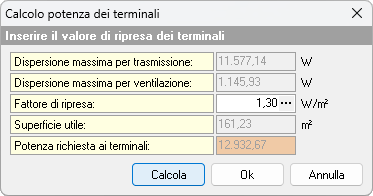 Successivamente, premendo il pulsante OK, il valore calcolato verrà riportato automaticamente nel campo Potenza termica totale terminali.