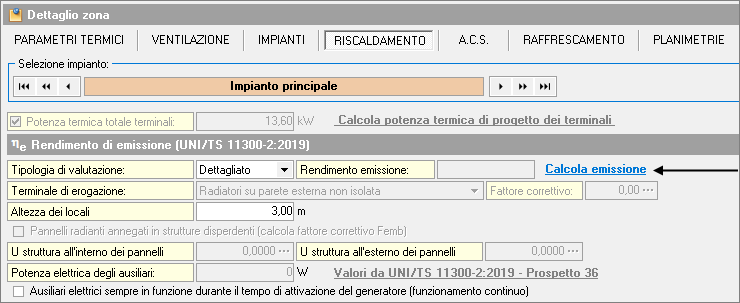 Se si sceglie l'opzione Calcolato, è necessario selezionare il tipo di terminale e, se richiesto, l'altezza media dei locali. Il programma recupera i valori dalle tabelle UNI/TS 11300-2 per calcolare il rendimento di emissione.