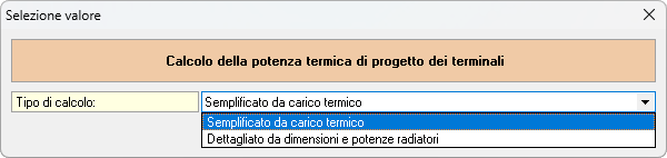 Selezionando la modalità Dettagliato da dimensioni e potenze radiatori, si aprirà una finestra dedicata per l'inserimento dei dati necessari al calcolo della Potenza termica totale terminali.