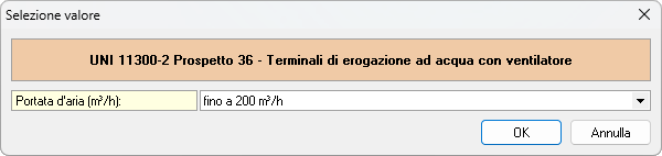 Se il terminale di erogazione è un termoconvettore, ventilconvettore, generatore d'aria calda o aerotermo, è possibile inserire la potenza elettrica degli ausiliari necessari all'erogazione. Il software calcola l'energia elettrica necessaria per l'emissione e la quota eventualmente recuperata come calore. Se il valore non è noto, è possibile utilizzare il pulsante Valori da UNI/TS 11300-2:2019 Prospetto 36 e selezionare la portata d'aria.