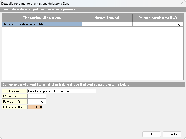 L' opzione Dettagliato consente di eseguire il calcolo analitico delle perdite termiche quando all'interno dello stesso vano sono presenti più tipologie di terminali di emissione. La funzione permette di gestire in modo distinto le caratteristiche tecniche e prestazionali di ciascun terminale, restituendo una valutazione puntuale delle dispersioni associate ai singoli emettitori e al loro contributo complessivo nel sistema di emissione