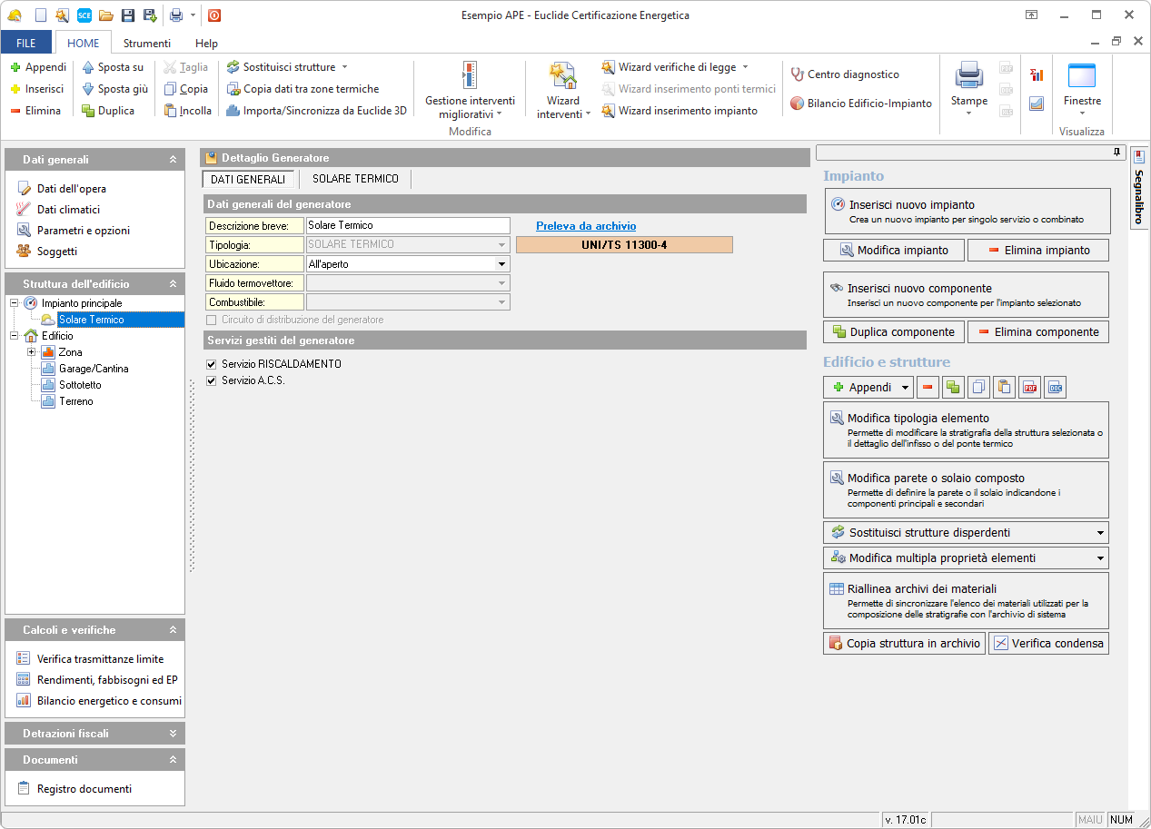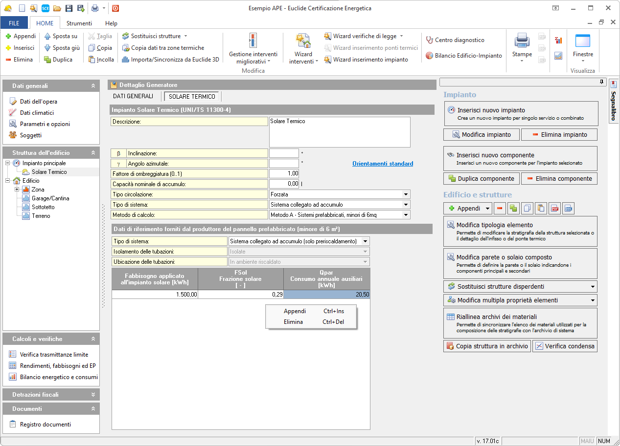 Nella pagina Solare Termico è necessario inserire tutti i dati utili per il calcolo delle prestazioni dell'impianto. Oltre alla descrizione e all'ubicazione, occorre specificare: