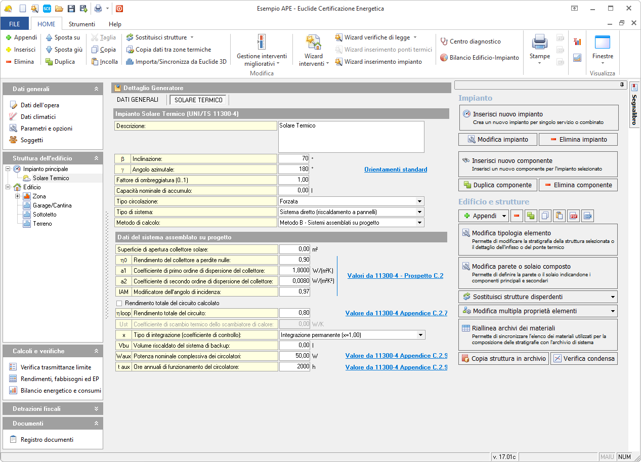 Metodo A: da utilizzare per impianti prefabbricati con area dei collettori inferiore a sei metri quadri. In questo caso, i dati richiesti sono forniti direttamente dal produttore e riguardano le prestazioni del sistema in funzione del fabbisogno termico.Metodo B: da utilizzare per impianti assemblati in loco su progetto. In questo caso, è necessario inserire i dati caratteristici dei componenti, ottenuti da prove secondo le norme di prodotto o, se non disponibili, selezionare i valori dai prospetti normativi tramite gli appositi pulsanti.