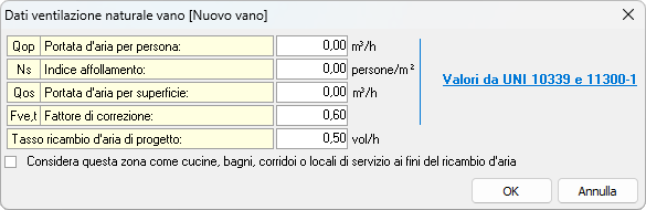 Nella finestra Dati ventilazione naturale vano è possibile indicare se la zona selezionata deve essere considerata come cucina, bagno, corridoio o locale di servizio ai fini del ricambio d'aria, secondo la UNI 11300-1:2014, punto 12.1, abilitando la relativa spunta.