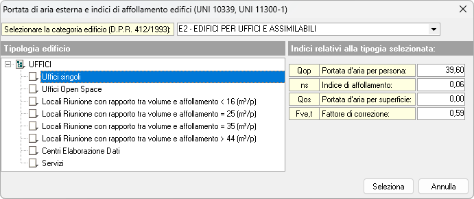 Se alcuni valori non sono noti, è possibile utilizzare il pulsante Valori da UNI 10339 e 11300-1 per richiamare la finestra di dialogo Portata di aria esterna e indici di affollamento edifici. In questa maschera occorre selezionare la categoria e la tipologia di edificio per recuperare i valori normativi, visualizzati nel lato destro della finestra.