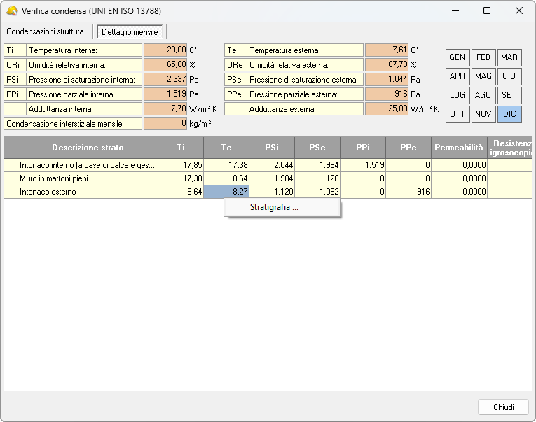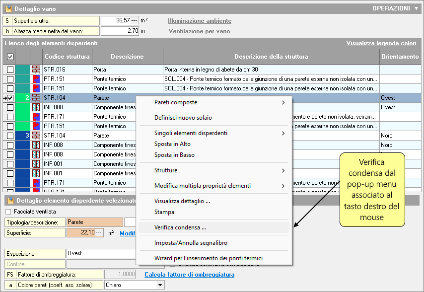 Per verificare la condensa di una singola struttura è possibile utilizzare il relativo comando del menu associato al tasto destro del mouse, cliccando su una struttura opaca, all'interno dell'Elenco degli elementi del Dettaglio vano.
