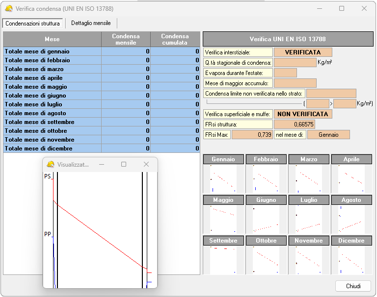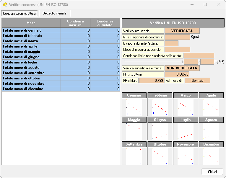 Euclide Certificazione Energetica effettua, per ciascuna struttura opaca inserita, la verifica della condensa sulla base della norma UNI EN ISO 13788. In particolare vengono verificate l'assenza di condensa superficiale e l'assenza (o l'evaporazione) di condensa interstiziale durante l'anno.