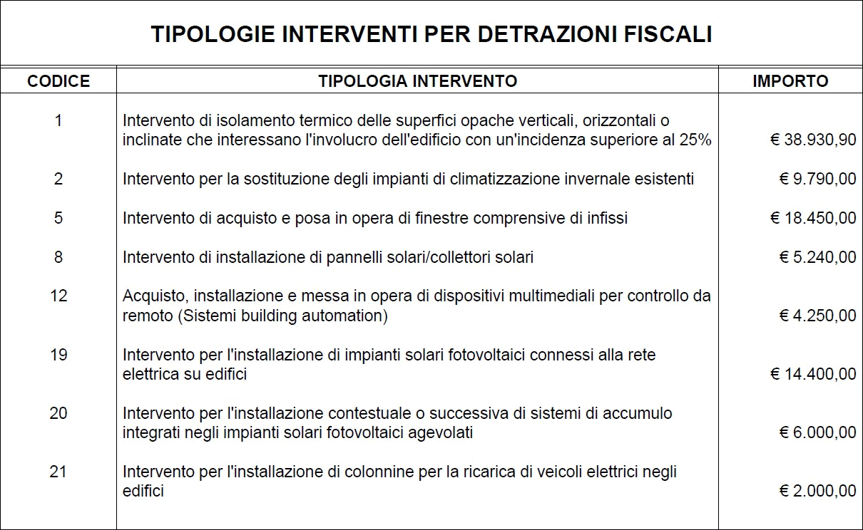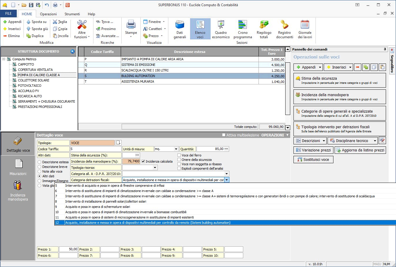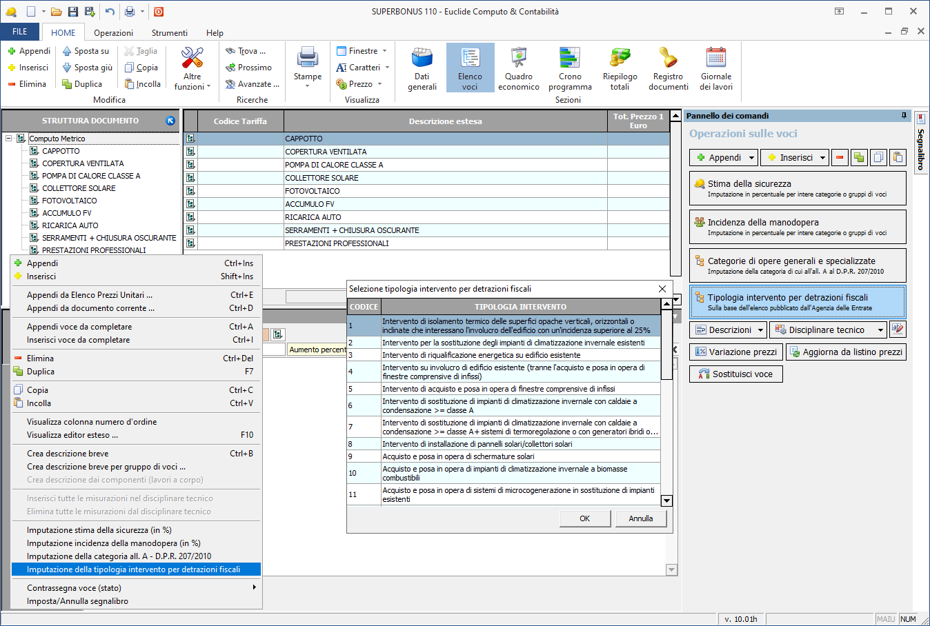 Euclide Computo & Contabilità permette di associare ciascuna voce di computo ad una delle tipologie di intervento definite dall'Agenzia delle Entrate e contenuto nelle istruzioni per la compilazione della "Comunicazione dell'opzione relativa agli interventi di recupero del patrimonio edilizio, efficienza energetica, rischio sismico, impianti fotovoltaici e colonnine di ricarica"