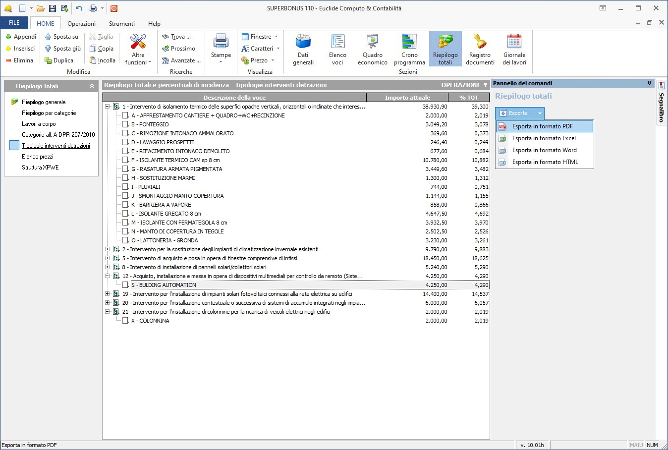 Utilizzando questa ulteriore suddivisione il prospetto generato da Euclide terrà conto delle corrette ripartizioni indicando il parziale per ciascuna unità.