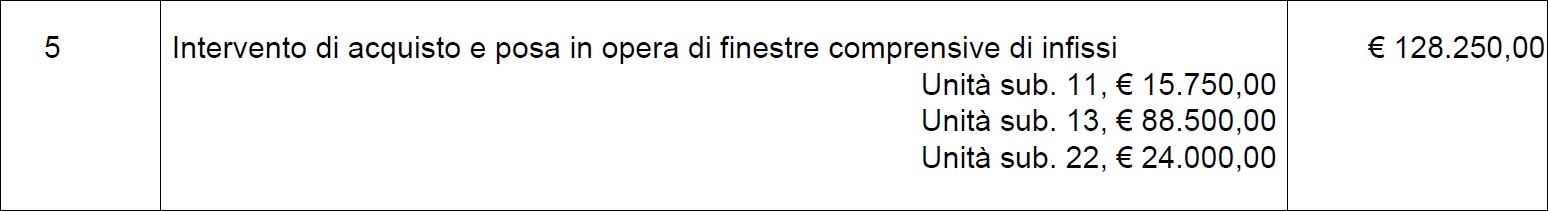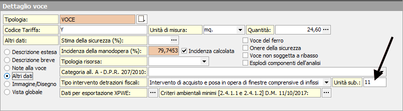 È possibile specificare per ciascuna voce e/o categoria di lavoro anche per quale unità immobiliare l'importo deve essere considerato. Nel campo Unità sub. andrà inserito il numero di subalterno al quale la voce si riferisce. Il campo potrà invece essere lasciato vuoto per le voci che riguardano le parti comuni del condominio oppure se si tratta di un intervento riguardante un edificio unifamiliare o assimilato.