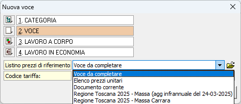 - Voce da completare: inserimento manuale di una voce libera (descrizione, unità di misura, prezzo, ecc.)