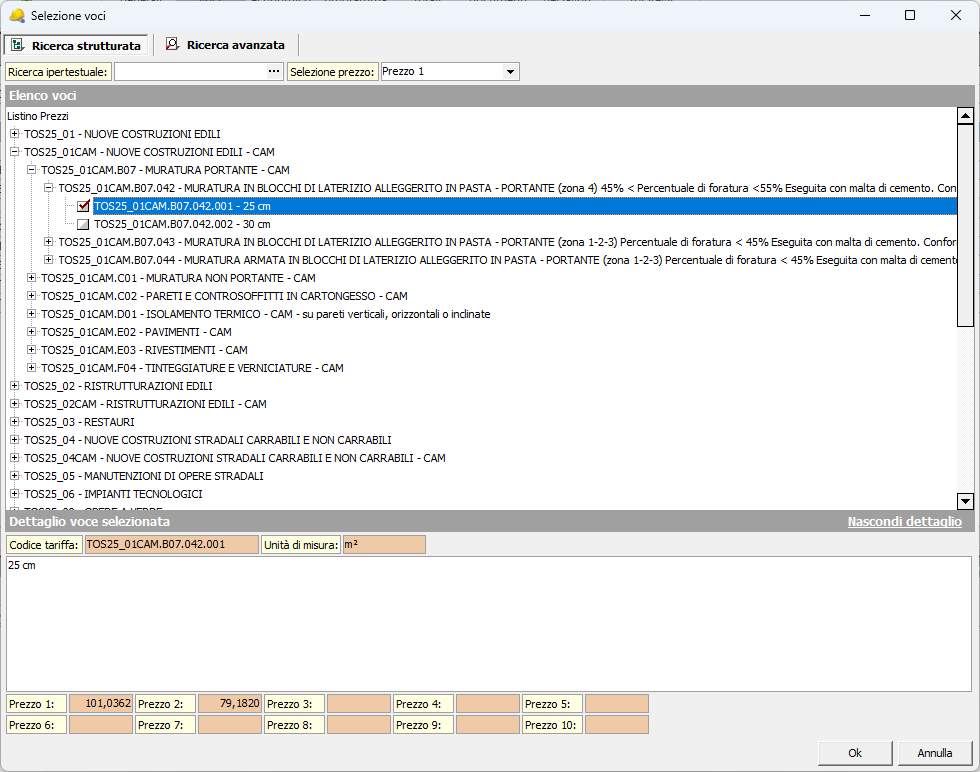 - Ricerca strutturata: visualizza il listino ad albero, suddiviso per categorie gerarchiche. Si naviga tra le categorie (es. "Nuove costruzioni edili" → "Muratura portante") e si selezionano le voci desiderate, anche in multiselezione.