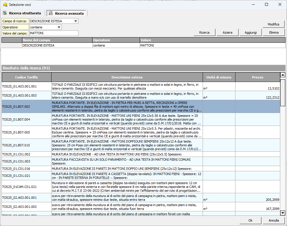 - Ricerca avanzata: consente di filtrare le voci tramite uno o più criteri di ricerca (es. tutte le voci che contengono "MATTONI"). Anche qui è possibile la multiselezione.