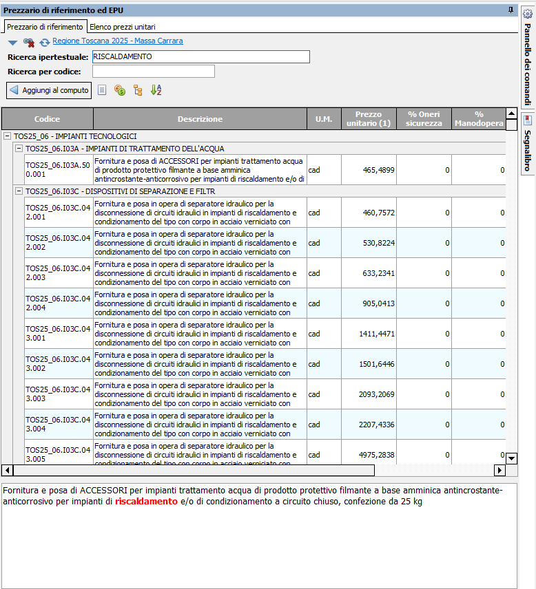 Prezzario di riferimento: il prezzario selezionato viene caricato automaticamente all'apertura del documento. Le voci possono essere ricercate tramite: