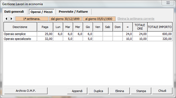La gestione dei lavori in economia avviene tramite liste plurisettimanali in cui vengono indicati operai, mezzi, provviste e forniture di materiale a fattura.