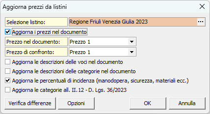 La funzionalità Operazioni | Modifica prezzi e descrizioni | Aggiornamento da listino prezzi permette di aggiornare automaticamente i prezzi e le varie percentuali di incidenza delle voci inserite in un computo metrico sulla base di un prezzario regionale aggiornato.