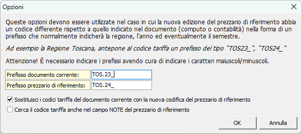 Il pulsante Opzioni permette di gestire i casi in cui la nuova edizione del prezzario di riferimento abbia un codice tariffa differente rispetto a quello indicato nel documento (computo o contabilità) nella forma di un prefisso, che normalmente indica la regione, l'anno ed eventualmente il semestre.