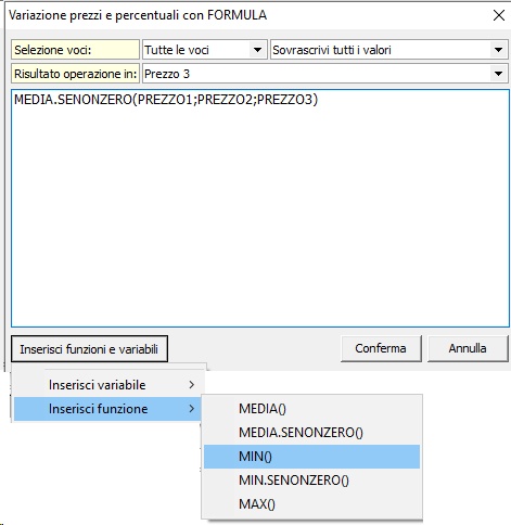 La funzionalità permette di salvare in una delle dieci fasce di prezzo (o in uno dei campi relativi alle percentuali di incidenza) il risultato di una formula che può contenere variabili, operatori aritmetici e funzioni.
