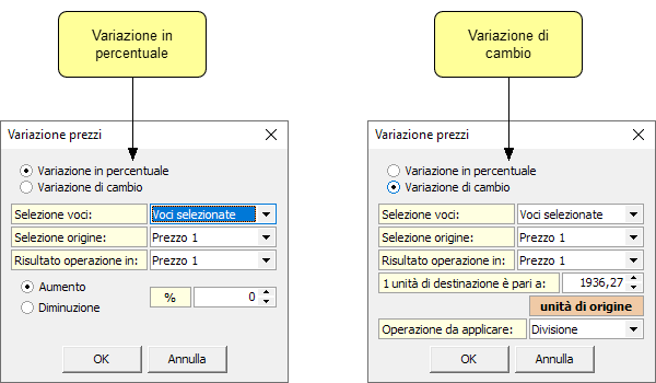 È possibile scegliere se applicare le variazioni ad un gruppo di voci selezionato oppure all'intero documento e selezionare la classe di prezzo sulla cui base effettuare il calcolo e la classe di prezzo destinazione (ossia quella in cui memorizzare il risultato).