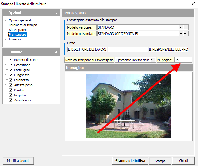 È possibile indicare il numero di pagine dalla finestra di stampa del Libretto delle misure, selezionando la sezione Frontespizio ove è presente un'apposita casella di testo.