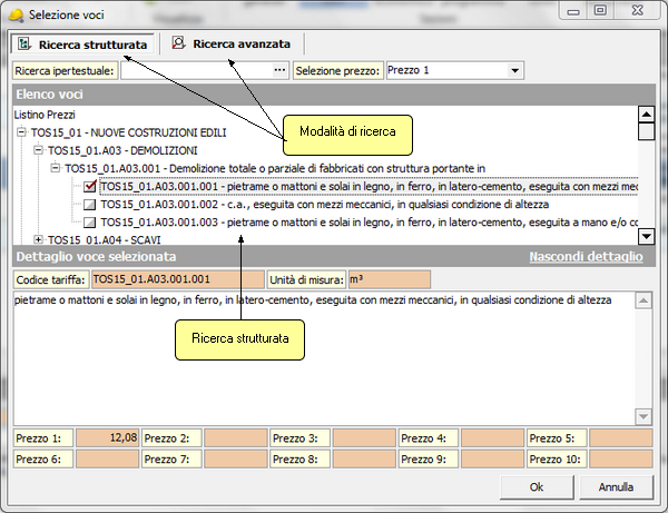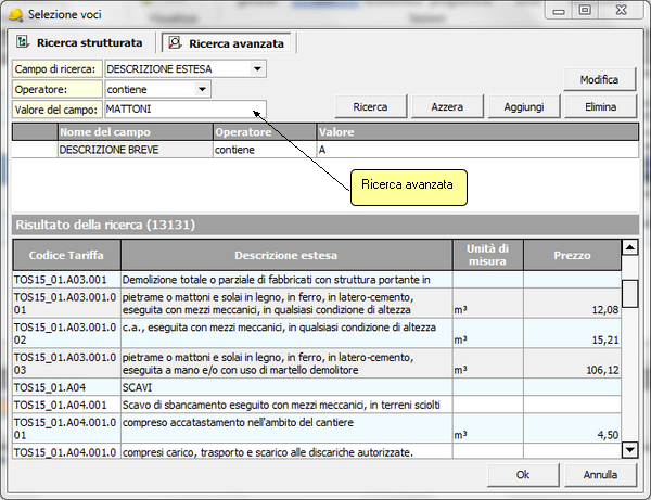 - Ricerca avanzata: consente di filtrare le voci del listino prezzi impostando uno o più criteri (ad esempio, una parola chiave come “MATTONI”). Anche in questo caso è possibile selezionare più voci contemporaneamente.