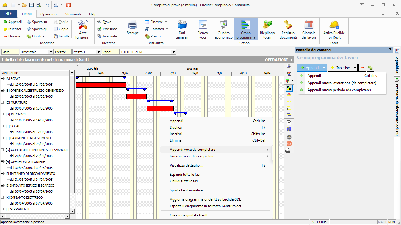 Utilizzare i comandi Appendi voce da completare o Inserisci voce da completare (Lavorazione o Periodo) disponibili nel popup menu (tasto destro del mouse), nel pulsante Operazioni e nel Pannello dei comandi. Questa modalità è utile per inserire lavorazioni non presenti nei documenti di computo o contabilità, oppure per aggiungere periodi personalizzati.