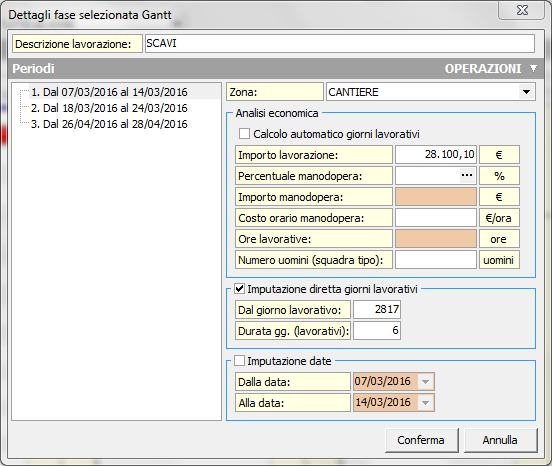Questa funzionalità consente di modificare i dettagli di una fase lavorativa nel diagramma di Gantt. È quindi possibile impostare la descrizione del periodo, la zona di cantiere, la percentuale di completamento della lavorazione e la modalità di calcolo dei giorni lavorativi che comprende tre modalità: