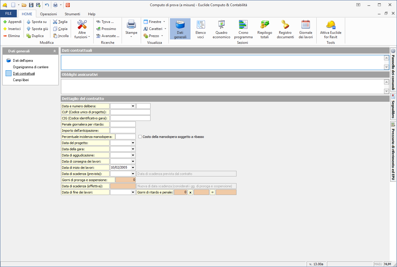 La pagina Dati contrattuali permette di inserire i dettagli del contratto ed eventuali obblighi assicurativi.