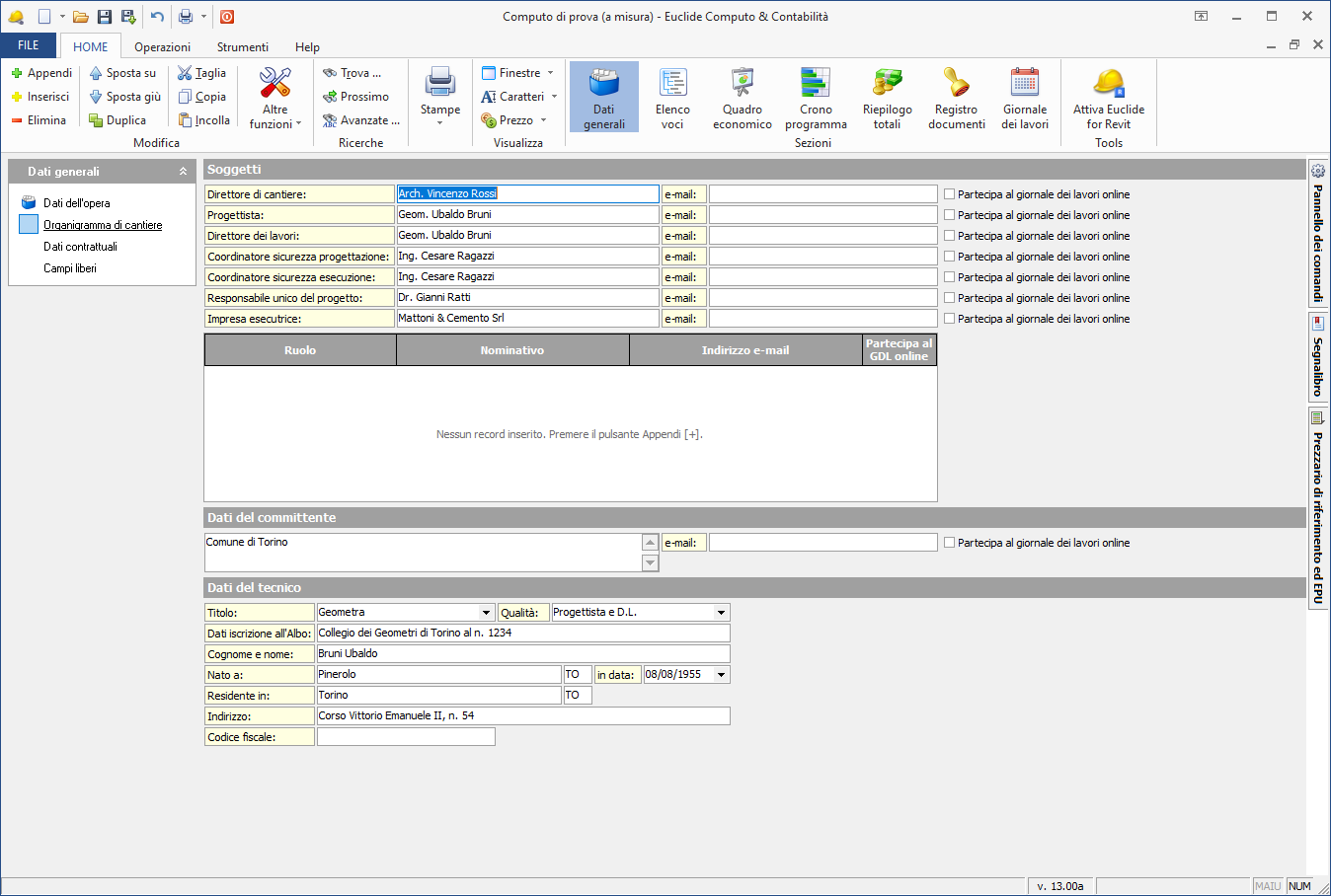 La pagina Organigramma di cantiere permette di definire tutti i soggetti coinvolti, a vario titolo, nell'opera.