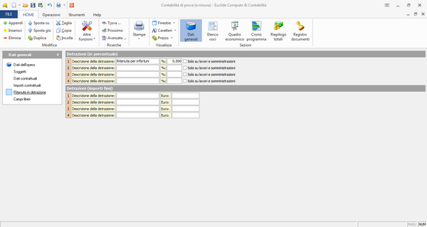 Nella pagina Ritenute in detrazione, presente solo all'interno delle contabilità dei lavori, devono essere inserire le detrazioni da applicare in fase di emissione del certificato di pagamento.
