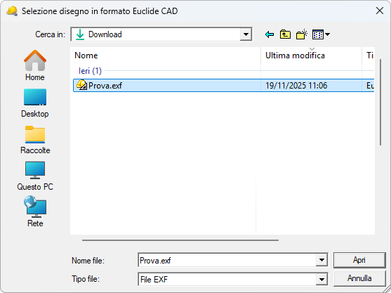 Una volta selezionata la seguente funzione, si aprirà una finestra in cui sarà necessario selezionare il disegno in formato .EXF, precedentemente creato con Euclide CAD.