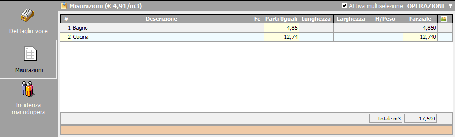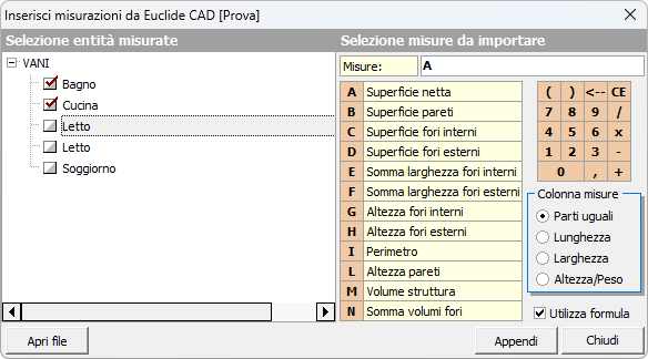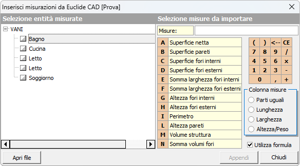 Successivamente, occorrerà indicare in quale colonna inserire la misurazione. Le colonne disponibili sono: Parti uguali, Lunghezza, Larghezza e Altezza/Peso.