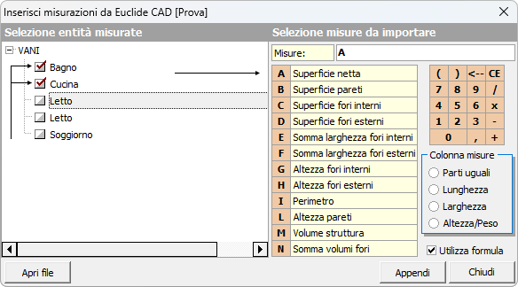 Dopo aver completato tutte queste scelte, biosgnerà cliccare sul comando Appendi per importare le misurazioni all'interno della sottosezione Misurazioni, rendendo immediatamente visibili i dati selezionati.