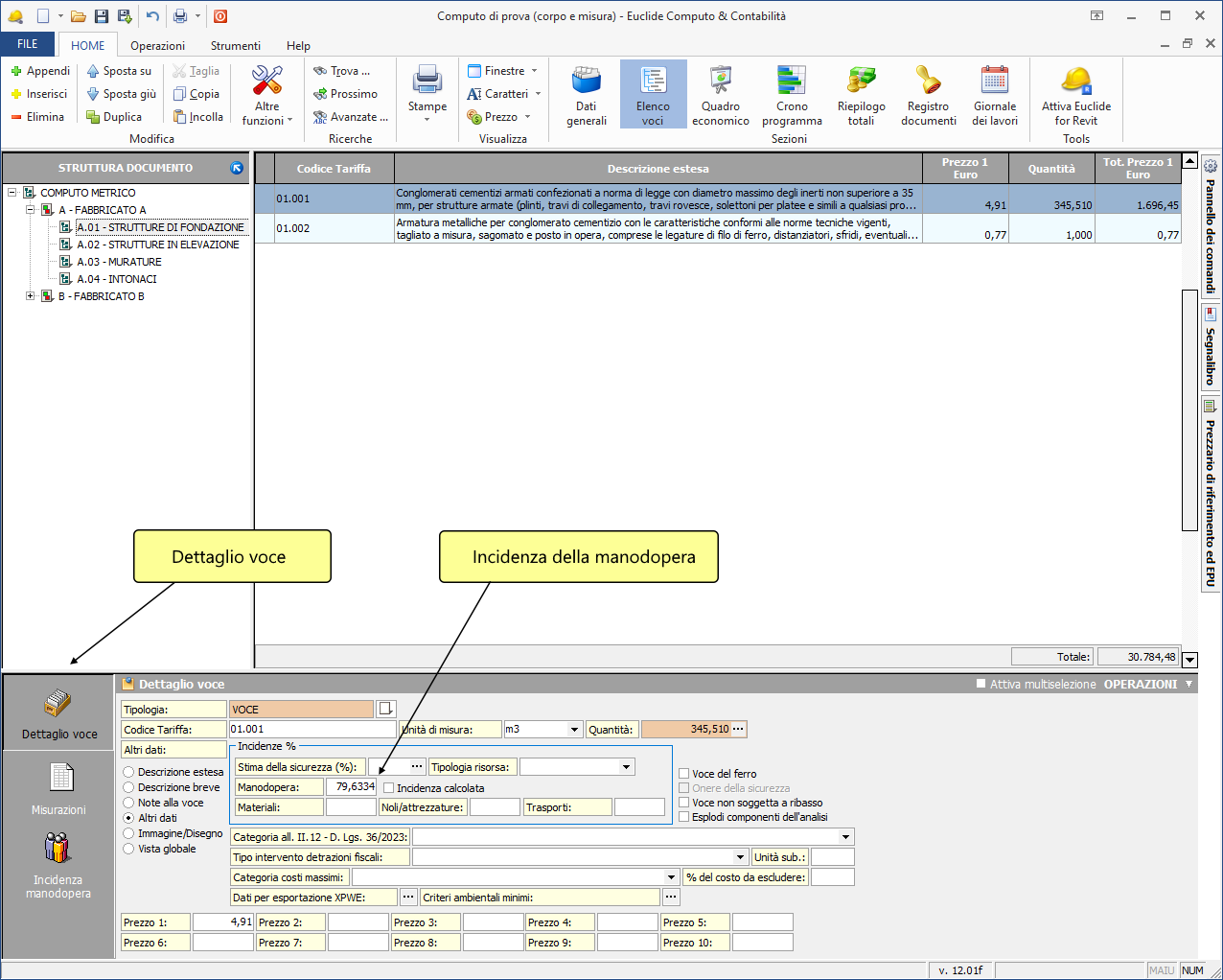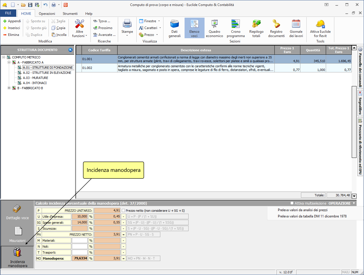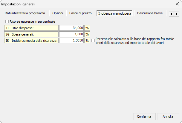 Alcuni listini prezzi vengono distribuiti con il valore dell'incidenza percentuale della manodopera già preimpostato. In questi casi, all'inserimento della voce, il programma acquisisce automaticamente anche la percentuale di incidenza.