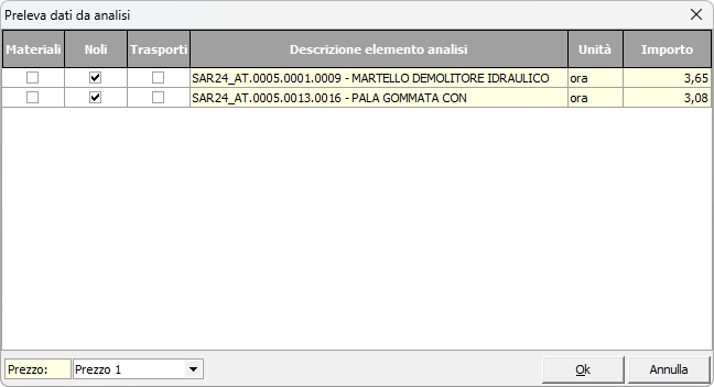 L'incidenza della manodopera può essere calcolata prelevando i valori delle risorse (materiali, noli e trasporti) direttamente da un'analisi prezzi già esistente, tramite la funzione Preleva valori da analisi dei prezzi disponibile dal pulsante OPERAZIONI.