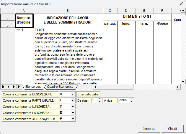 Il comando Importa misure da file XLS, disponibile all'interno della sezione Elenco voci | Misurazioni (accessibile dal popup menu associato al tasto destro del mouse oppure dal pulsante Operazioni), permette di aprire un file in formato Microsoft Excel e di associare le colonne alle dimensioni (Parti uguali, Lunghezza, Larghezza, Altezza/peso).