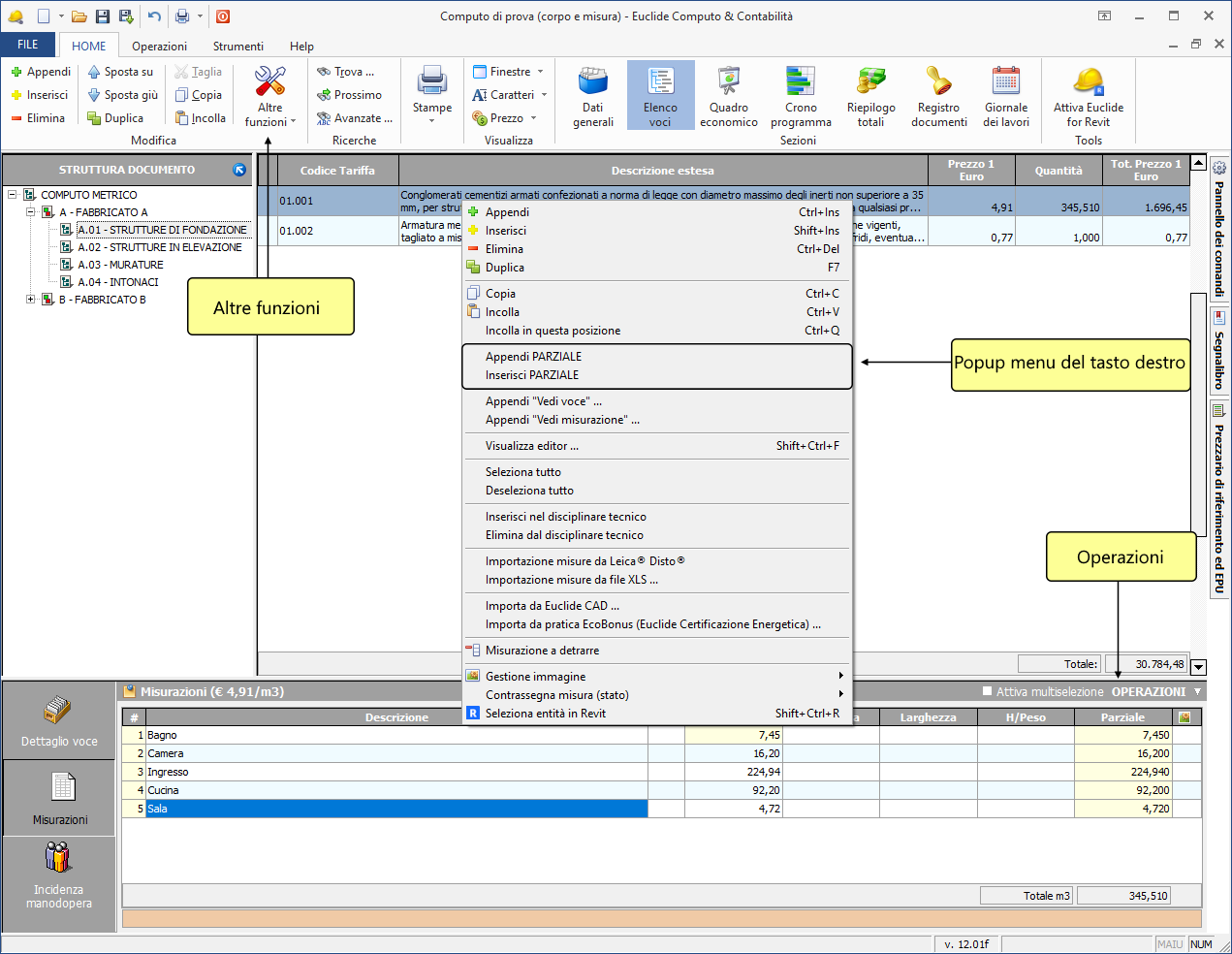 Per inserire un rigo parziale sono disponibili le funzioni della scheda HOME | Altre funzioni: