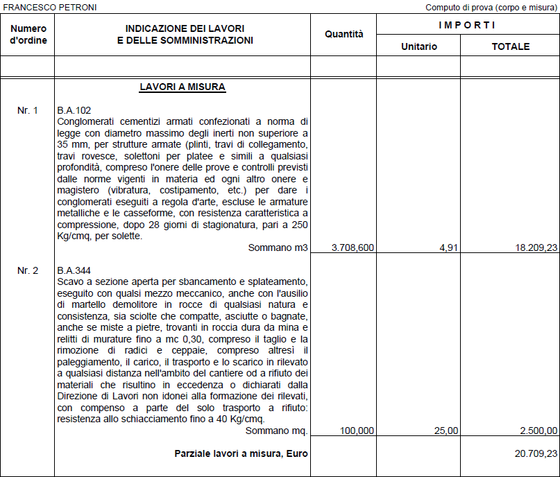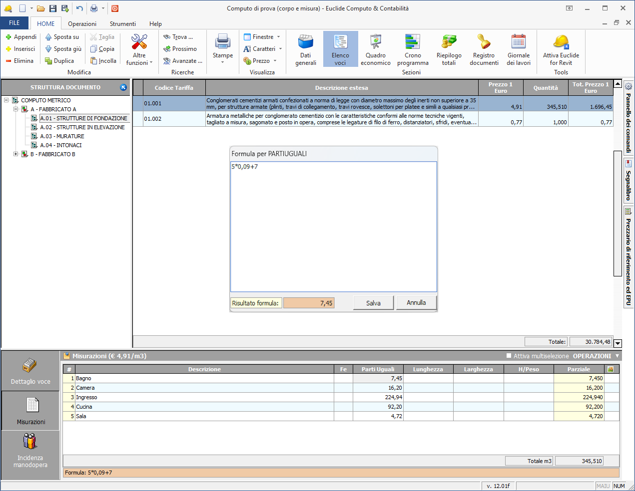 Nell'esempio della figura precedente, per la posa in opera di un pavimento in un piccolo appartamento sono stati inseriti quattro righi di misurazione (Camera, Cucina, Sala, Ingresso), ognuno dei quali contiene una formula in Parti Uguali.