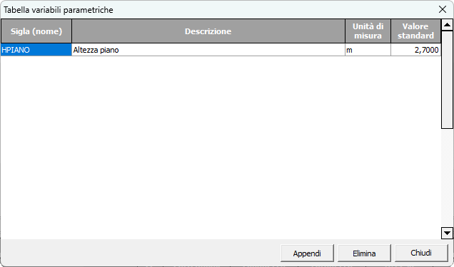 È possibile inserire o modificare le variabili tramite la funzione Operazioni | Modifica variabili parametriche. Ad esempio, si può definire la variabile HPIANO con valore pari a 2,70 metri.