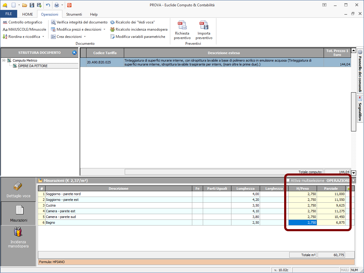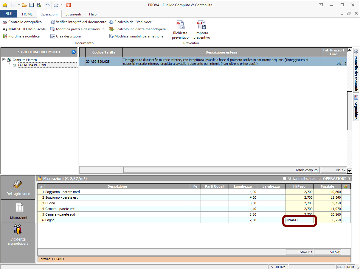 Modificando successivamente il valore della variabile (ad esempio impostando HPIANO a 2,75 metri), tutte le quantità e i prezzi totali delle voci che utilizzano tale variabile verranno aggiornati automaticamente.