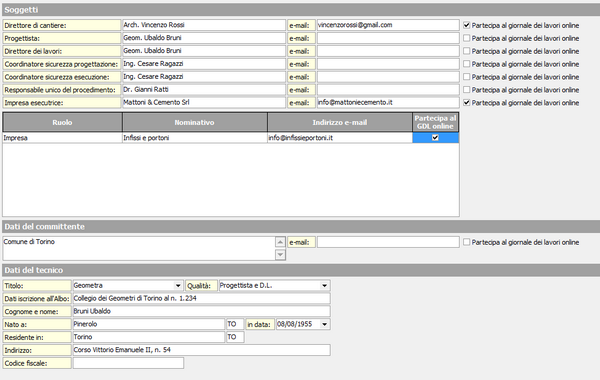 Ai fini della redazione del giornale dei lavori è possibile specificare, per ciascun soggetto, un indirizzo e-mail e un flag che indica se il soggetto verrà invitato a partecipare al giornale dei lavori online (www.euclidegdl.it).