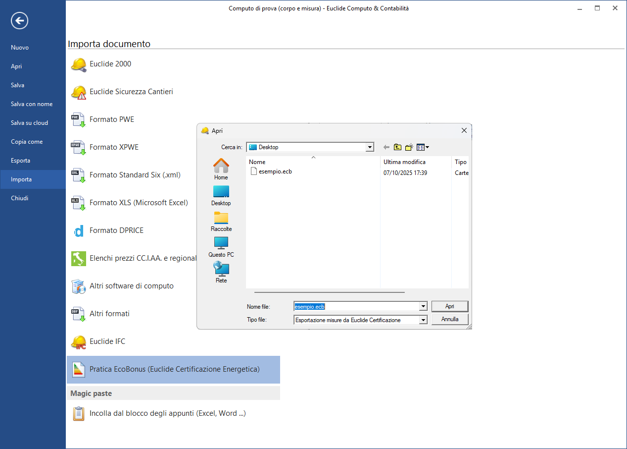 Accessibile dalla barra multifunzioneFILE | Importa | Pratica EcoBonus (Euclide Certificazione Energetica), questa funzione consente di generare un nuovo computo metrico partendo dalla pratica esportata.Importa da pratica EcoBonus: