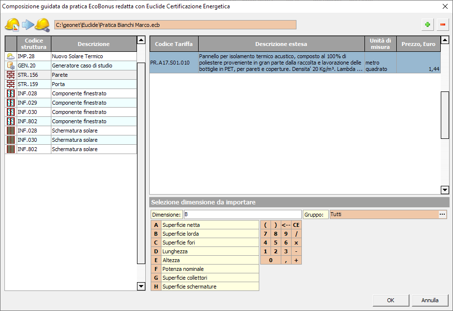 Dopo aver selezionato la funzione Pratica EcoBonus (Euclide Certificazione Energetica) dalla barra multifunzione, individuare e scegliere il file .ECB da importare. La procedura guidata mostrerà un'interfaccia che raggruppa per tipologia e codice tutti gli elementi modificati nella pratica EcoBonus.