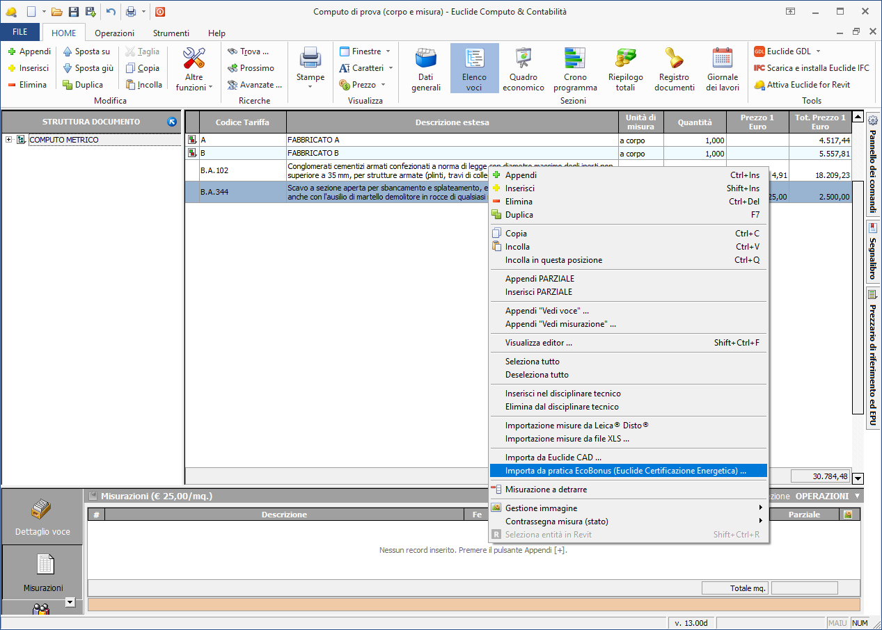 La funzione Importa da pratica EcoBonus consente di importare le misurazioni relative a una voce di computo selezionata. Questa funzione è disponibile nella sezione Elenco voci | Misurazioni (tramite popup menu o dal pulsante OPERAZIONI).