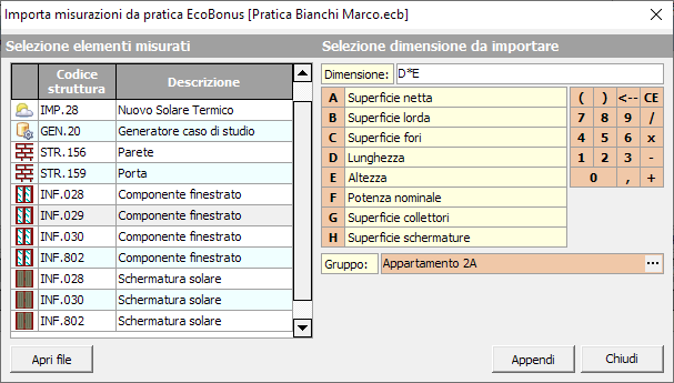 Dopo aver selezionato il file .ECB, il sistema avvierà una procedura guidata per l'inserimento delle misurazioni nella voce corrente. Premendo il pulsante Appendi, le misurazioni verranno aggiunte agli elementi selezionati.