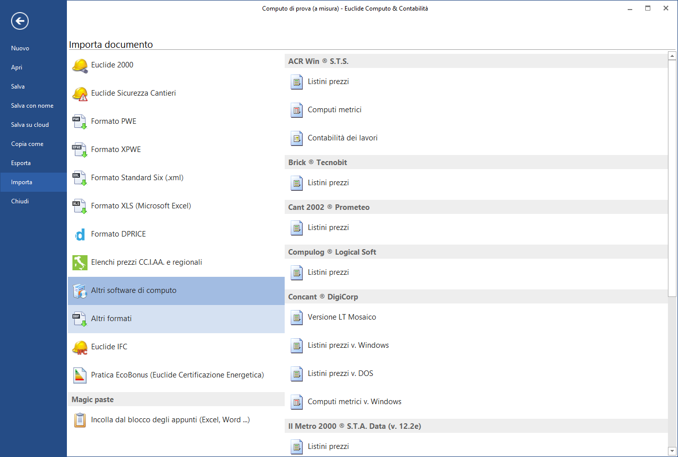 Sono disponibili anche apposite funzioni che permettono l'importazione da altri software che però, con l'avvento dei formati di interscambio dei dati (pwe, xpwe, xml standard six) - adottati sostanzialmente da tutti i maggiori produttori - sono diventate di scarsa utilità e non vengono più aggiornate.