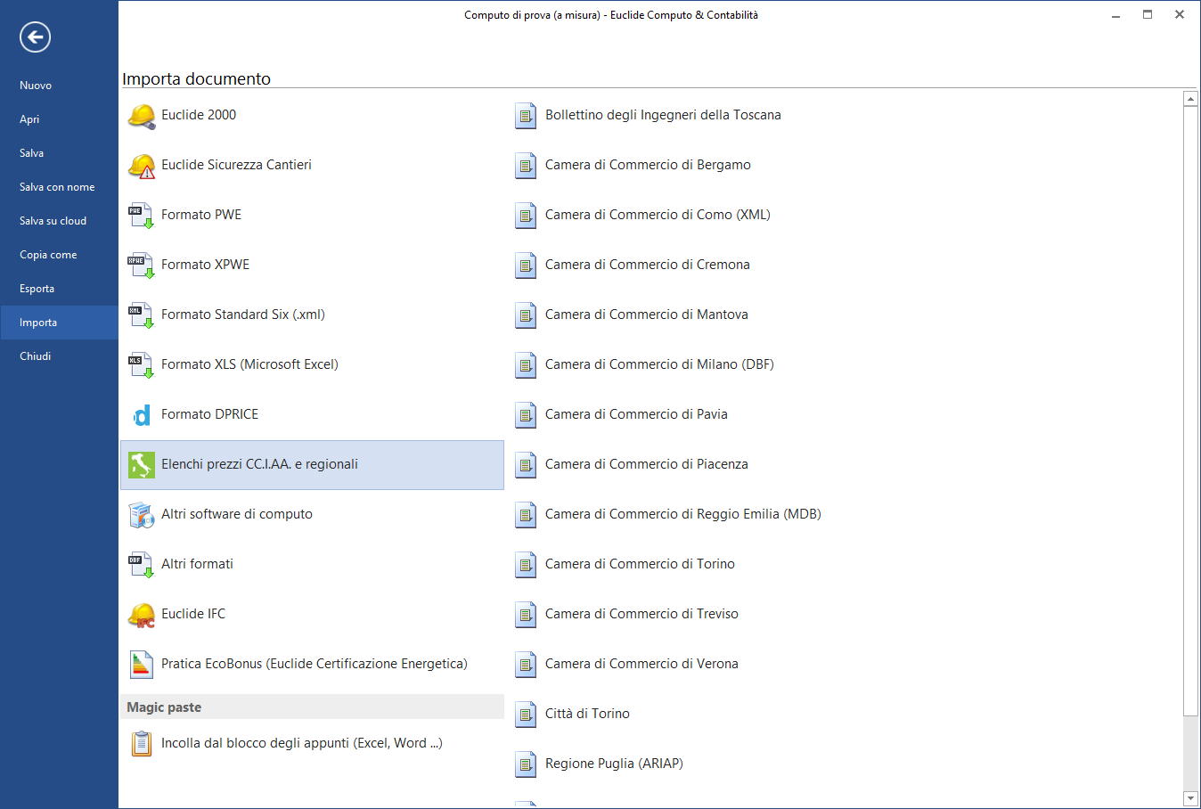 Analogamente, le funzioni di importazione dei prezzari editi da camere di commercio o altri editori, a fronte del fatto che essi vengono ora distribuiti per la maggior parte direttamente in formato Euclide (o comunque in un formato di interscambio dati), non vengono sostanzialmente più utilizzate.
