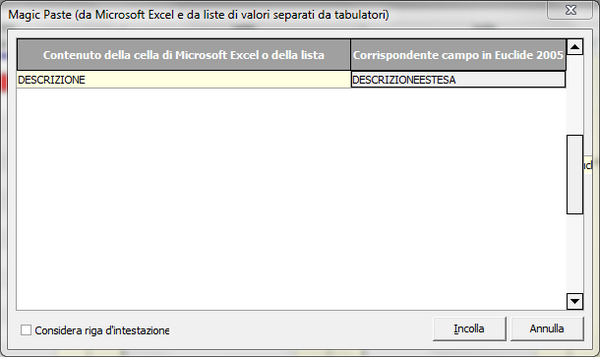 - Associare i dati importati ai campi di riferimento di Euclide, utilizzando la finestra Magic Paste.