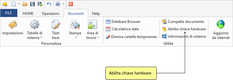 La funzione Abilita chiave hardware, accessibile dal menu principale Strumenti, consente di abilitare la chiave hardware direttamente dal programma, qualora sia già installato ed abilitato un altro software della suite Euclide che utilizza la stessa tipologia di chiave.