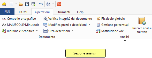 La sezione Analisi all'interno della scheda Operazioni è presente soltanto nella tipologia di documento Listino prezzi e presenta le seguenti funzionalità:
